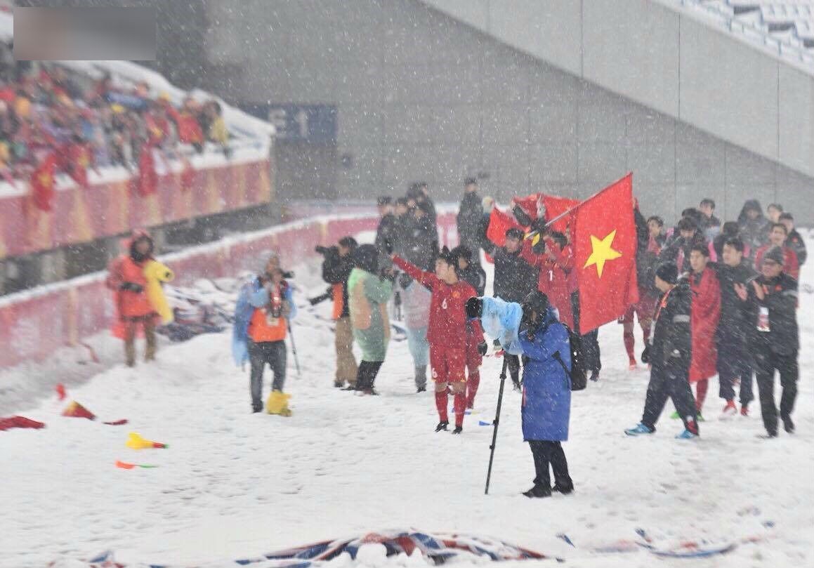 U23 Việt Nam giương cao lá cờ Tổ Quốc giữa mặt sân trắng tuyết ở sân vận động Thường Châu.